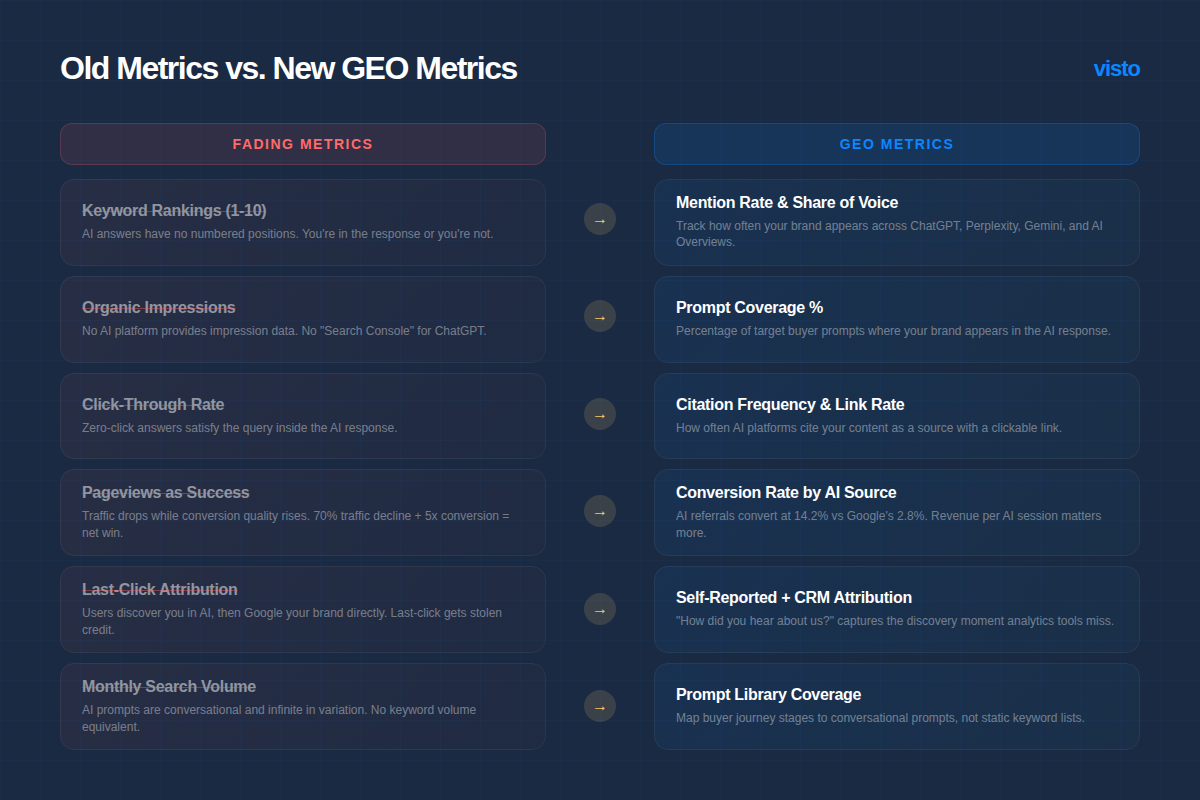 Organic impressions → Prompt coverage (% of target prompts where you appear). No AI platform provides impression data. There's no "Search Console" for ChatGPT.